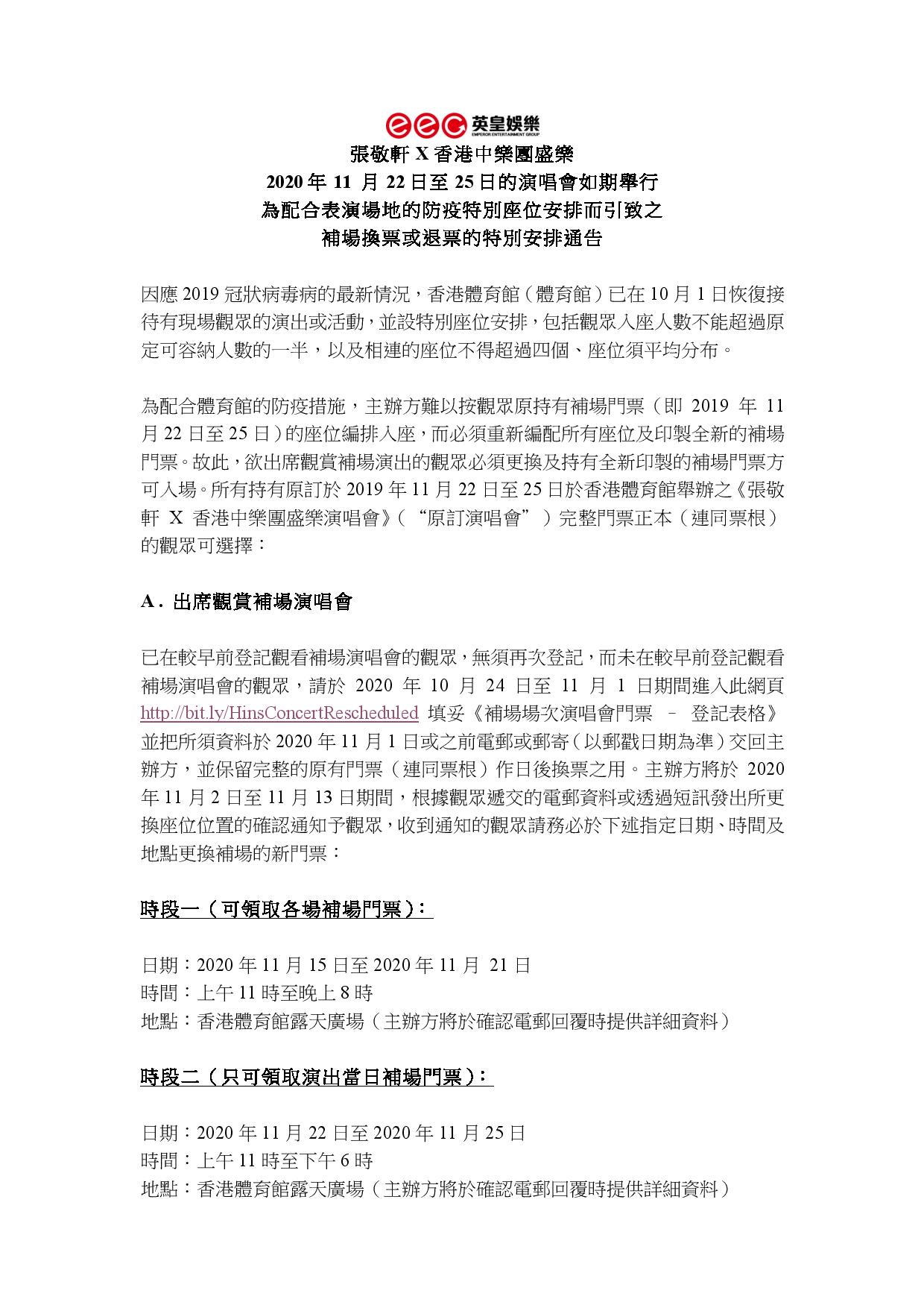 有關「張敬軒x 香港中樂團盛樂演唱會」補場換票或退票的安排,敬請留意。